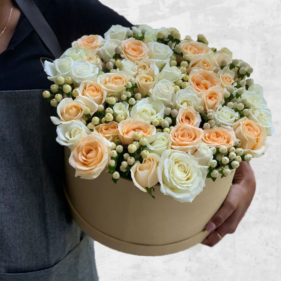 Rosas em tons de pastel, com hypericum branco, embalado numa elegante caixa redonda.